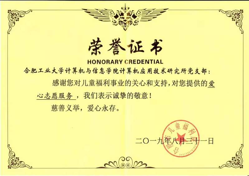 近日,应用所党支部收到合肥儿童福利院送来的荣誉证书,感谢应用所党支部的党员、研究生暑假期间对合肥儿童福利院的爱心活动。