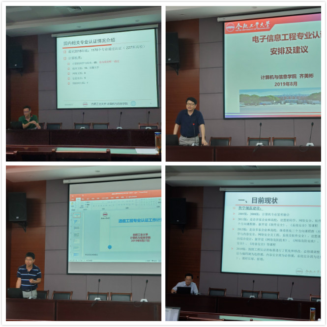 上午的推进专业认证的工作安排交流与研讨板块中,计算机科学与技术系主任安鑫、电子信息工程系系主任齐美彬、通信工程系系主任孙锐等,分别针对本专业的专业认证工作安排进行了交流,与会代表也进行了交流和研讨。最后,教学指导委员会主任胡学钢对学院专业认证主要工作与研讨交流平台方案提出了工作建议和平台建设方案,希望能为各专业的认证提供参考方案、交流平台等,并提出学院将按照“统筹安排,精准部署;各司其职,同步推进;交流研讨,共同提高”来指导后续专业认证的工作建议:即依据认证相关工作的要求来制定阶段性工作安排节点,每个阶段明确精准的任务目标、潜在的问题及相应的应对措施、工作模式、评测办法等;各专业、各位工作人员都有明确的职责分工、阶段工作目标等,在此基础上,以领导组统筹同步推进;对过程中遇到的问题进行研讨、交流,形成共识以及解决办法,从而带动整体的发展。