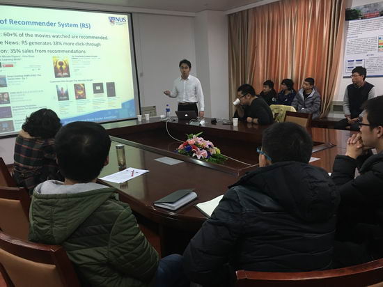 在张含望博士题为“On the Connection between Vision and Language”的报告中,张博士从scale、technique和depth三个视角回顾了近三十年来视觉信息处理与分析发展的历程,并指出了当前相关领域发展主流所在。张博士继而介绍了他近年来在“image captioning”研究领域里取得的进展,介绍了从隐式语义、视觉注意、视觉依赖关系等精细化角度进行图像内容的自动理解思路与方法。在何向南博士主题为“多媒体推荐系统的协同过滤”报告中,何博士分别提出了一种快速准确的矩阵分解算法和一种基于神经网络的矩阵分解框架,解决了隐式反馈中负样本缺失、内积函数表示性低等核心难题。报告引起了在座师生的高度兴趣,大家纷纷就自己感兴趣的话题,与两位青年学者展开了深入的交流。