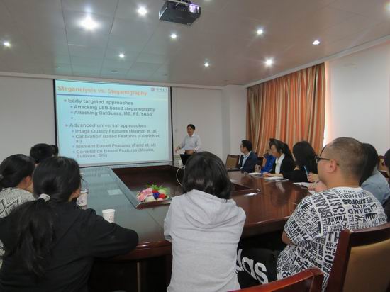 黄继武教授首先介绍了“steganography(隐写术)”和“Steganalysis(隐写分析)”的概念,黄教授指出隐写术是指将秘密信息通过特定的算法嵌入到常用媒体(图片,视频等)中并通过公开信道传输的技术。同时黄教授又通过一系列示例展示隐写术可能会被不法分子使用从而对社会产生危害,引出隐写术的对立面隐写分析。隐写分析是指通过特定的方法和技术发现含有隐秘信息的载体。黄教授指出:隐写术和隐写分析是相辅相成的关系,两个学科相互制约相互发展。接下来黄教授列举了一系列的隐写术算法和相应的隐写分析算法并深刻分析了各种算法的关系,并重点展望了隐写对抗技术目前面临的各种挑战,分析了隐写分析所面临的困难问题,并针对这些困难给出了自己的想法。黄教授的报告引起了在座师生的极大兴趣,大家分别就各自的研究兴趣与关注点出发,与黄教授开展了热烈深入的讨论。会后,应胡东辉所长的请求,黄教授又抽取宝贵的时间给大家做了一个简短的关于论文写作发表的报告,报告针对中国学者如何撰写高水平论文进行了深刻剖析和经验交流,让在座的老师和学生们受益匪浅。