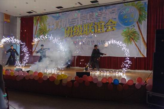灯光一暗,晚会的开场节目正式上演。四位双截棍社的社员身着道服,把双截棍耍得虎虎生风。更精彩的还在后面,随着灯光熄灭,双截棍上闪出绚丽的焰火,双截棍的舞动越趋华丽,一曲落罢,焰火停歇,同学们的热情已被彻底激起!之后四位主持人随着灯光的亮起一齐上台,精彩的开场白赢得现场掌声,之后的节目更是高潮迭起。歌舞剧《小丑漫游动物异世界》中小丑的精彩表演赢得全场喝彩。节目《爱》、《苹果杯子舞》歌舞双飞。吉他弹唱《谁的心在飞》更是让人惊叹我太阳集团tyc5997学生的才华横溢。一首《像梦一样自由》已经惊艳了全场,原创歌曲《浪子》更是令观众陶醉。舞蹈《let us dance》、《流星群》、《舞动时代》要么high翻全场,要么惹人陶醉。小品《梁祝》《推销》《撩妹培训班》的精彩表演同样赢得同学们的阵阵笑声。之后的歌曲《月儿与少年》在现场掀起狂潮。活动现场,线上微信墙的活动也成为亮点,“用五千的经费,办出了十万的效果”更是成为热门评论。