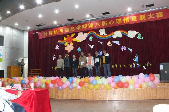 本届心理剧大赛以“拨开云雾•拥抱阳光”为主题,来自学院2015级9个班的学生以贴近生活、贴近现实的表演,借用“替身技术”“镜像技术” “角色扮演”等常规心理剧的表现手法,从亲情、友情等方面展示出了同学们在大学生活中出现的问题,分析问题并解决问题的过程,表现出同学们勇于面对挫折、不畏困难的积极生活态度和良好心理品质。