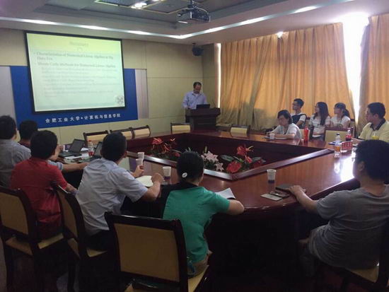 欧道明大学与我院有着较为密切的渊源,具有共同培养博士生的协议,我院已有一位教师与一位硕士通过其博士资格考试,在ODU攻读博士学位。黎耀杭博士在报告中介绍了ODU大学,并多次褒奖我们输送的两位优秀博士。整个报告是以大数据为起点展开的,针对在数据量极具增长的情况下,大规模矩阵运算是所出现的问题以及解决途径。首先,回顾了经典的乌兰•冯•诺伊曼算法,该方法用于线性算子方程。在蒙特卡罗与诺伊曼体系的中,其收敛的充分必要条件是一个长期被使用的法则。然而经典的乌兰•冯•诺伊曼算法收敛速度较慢,限制了其在一般线性系统的应用。通过在Krylov子空间中估计大系数矩阵的特征值与特征向量,在采样迭代采样过程中逐渐对特征值和特征向量精炼求优,进而在KryLov子空间中进行蒙特卡罗采样,得到的特征向量插入Krylov子空间后压缩进而加速线性求解的收敛。这种方法的内存和矩阵的有效性都得到了提升,可以在CPU处理器结构上高效地的实现。最后,黎博士介绍了该方法在生物信息学、图像分割、比赛预测等领域的广泛应用。