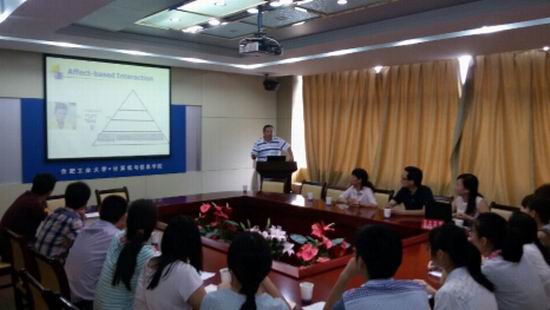 情感交流是下一代人机交互系统发展的关键。Qiang Ji教授介绍的情感驱动的人机交互研究的目的是开发一个可以实时跟踪用户情绪状态并通过及时干预,以使用户保持积极情绪状态的系统。该系统主要包括:多模态用户情感状态感知和用户辅助两个模块。 Qiang Ji教授重点就面部表情、动作行为、生理反应等用户表现阐述了多模态用户情感状态感知,以及基于决策理论框架给出最适当的用户调节和帮助的研究思路,并展示了相关实验效果。报告引起了在座师生的浓厚兴趣,大家分别就自己感兴趣的问题与Qiang Ji教授展开了积极交流。随后Qiang Ji 教授还来到情感计算与先进智能机器安徽省重点实验室,就实验室目前的课题研究内容、实验平台、实验开展情况与师生们进行了深刻探讨,并给出了指导性建议。