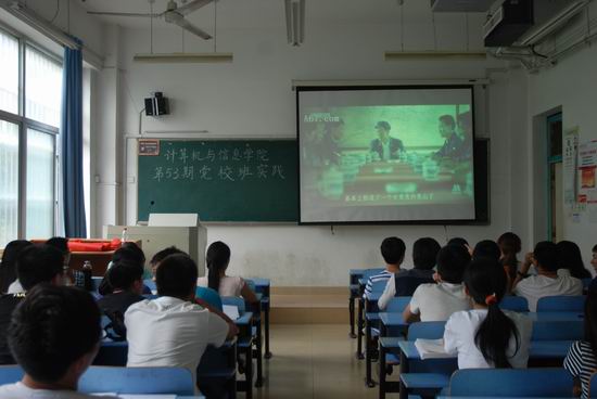 为加强爱国主义教育,汲取习近平总书记“勤学、修德、明辨、笃实”八字真经,探索和丰富党员精神宣传教育的有效载体及手段,同时加深入党积极分子对党的认识和理解,我院第53期入党积极分子班于6月15日下午3点在翡翠湖校区四教208成功举办了“影党史,映雄魄”的爱国主题教育活动。活动由2014级辅导员宋燕老师主持,第53期入党积极分子班的全体成员参与了本次活动。