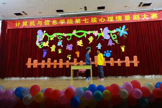 本届心理剧大赛以“破茧成蝶 逐梦青春”为主题,来自学院2014级9个班的学生以贴近生活、贴近现实的表演,借用“替身技术”“镜像技术”“空椅技术”“角色扮演”等常规心理剧的表现手法,从亲情、友情等方面展示出了同学们在大学生活中发现矛盾、分析矛盾、解决矛盾的过程,表现出同学们勇于面对挫折、不畏困难的积极生活态度和良好心理品质。