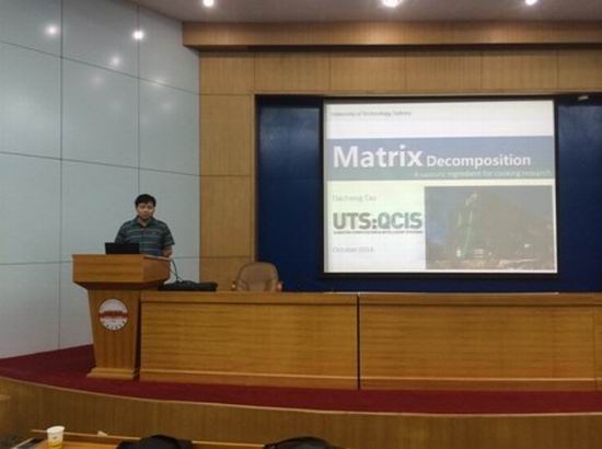 10月21日上午,应太阳集团tyc5997的邀请,澳大利亚悉尼科技大学陶大成教授在我校学术报告厅进行题为“Matrix Decomposition - A savoury ingredient for cooking your research”的学术专题报告。报告由我院“黄山学者特聘教授”汪萌教授主持,学院相关研究方向教师、以及对该方向具有浓厚兴趣的众多研究生与本科生踊跃参加了此次报告会。