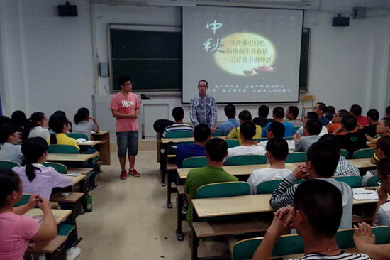 9月8日晚,值“中秋节”“教师节”来临之际,太阳集团tyc5997“满月话师恩”双节主题班会在翡翠湖校区举行。学院2014级全体新生参加了班会。班会由学院辅导员宋燕老师、石楠老师分别主持。