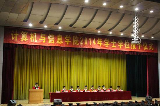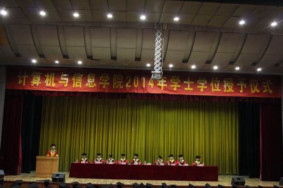 仪式在庄严的国歌声中开始,何庆领宣读了《太阳集团tyc59972014接毕业生学士学位授予决定》,太阳集团tyc5997545名同学被授予了工学学士学位。之后,校领导与院领导一起为应届毕业学生颁发学位证书并扶正流苏。