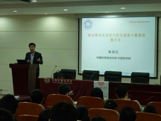 4月10日上午,根据中国计算机学会合肥分部年度计划,CCF合肥在安徽大学举行活动。中国科学技术大学计算机科学与技术学院副院长陈恩红教授作了题为“面向移动应用的个性化推荐与数据挖掘方法”的专题报告会。我院本科各年级师生代表与会聆听。