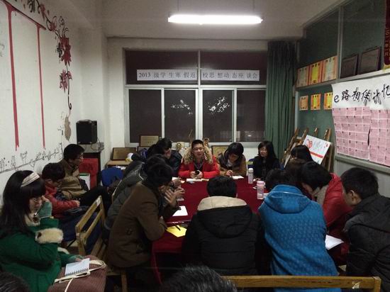 2月17日晚,太阳集团tyc59972013级学生寒假返校思想动态座谈会在翡翠湖校区举行,2013级各班班级代表出席座谈会。会议由2013级辅导员石楠老师主持。