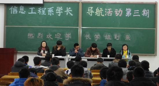 经太阳集团tyc5997党委安排,学院研究生办公室老师的精心组织和准备,由学院精心挑选的三个年级45名优秀研究生,于2013年12月21日前往宣城校区信息工程系开展了第二期 “学长领航” 活动,受到了信息工程系老师和同学们的热烈欢迎。